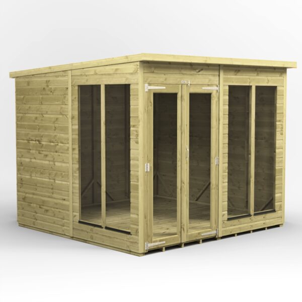 The Powersheds Premium Pent Summerhouse is a pressure-treated garden building at the pinnacle of summerhouse innovation. It is a great quality, modern, airy, modular summerhouse, made using high grade Scandinavian timber, joinery made doors with pre-fitted windows, and features tongue and groove walls, floor and roof!